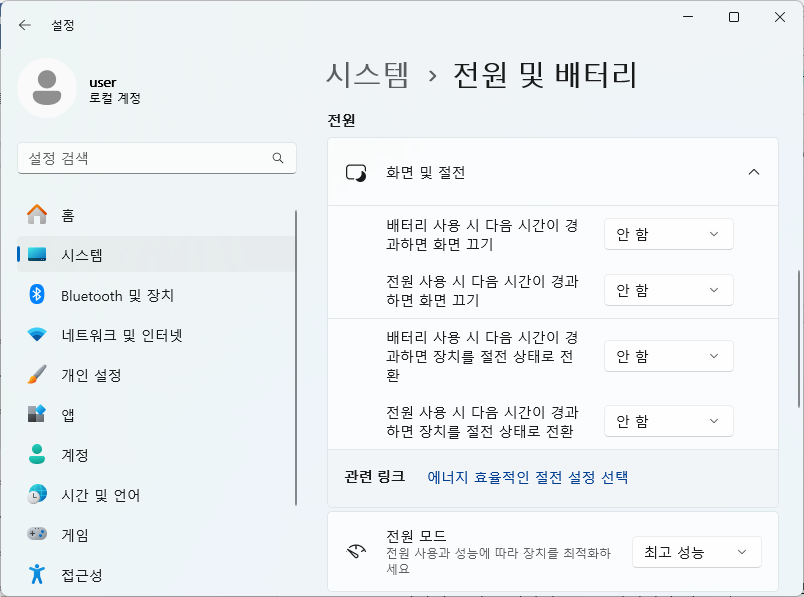 | 화면 및 절전 | 모두 “안함” |