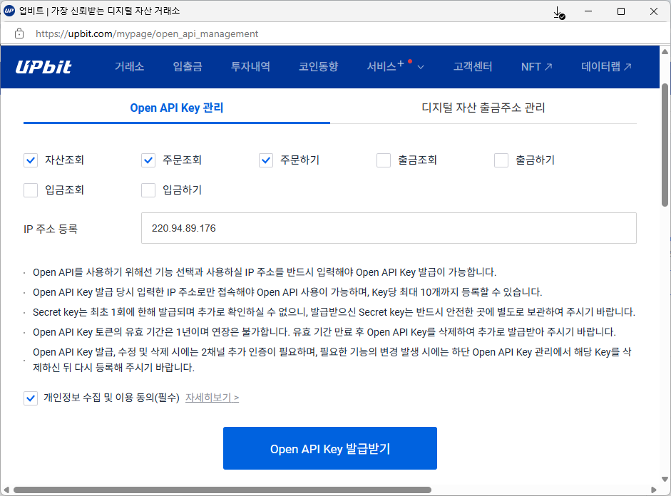 5.1.1 자산조회, 주문조회, 주문하기 체크 및 IP 등록¶