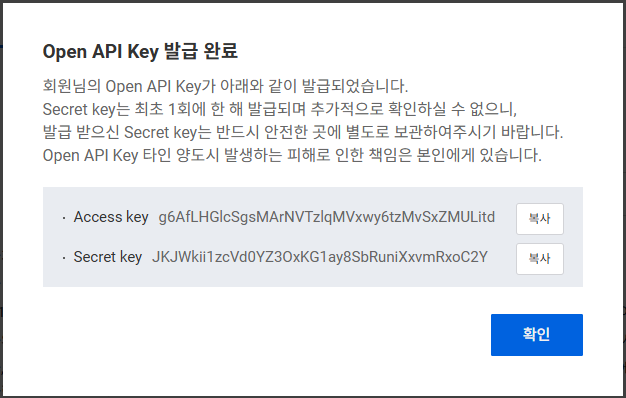 발급하면, 아래처럼 API키와 SECRET 키가 노출되며,