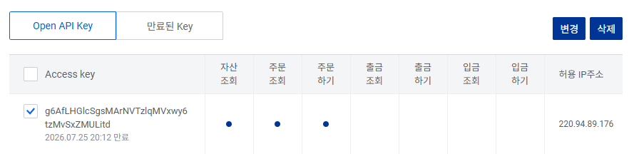 IP가 변경되거나, 추가되었을 경우, 이미 등록된 API를 선택후, [변경]을 눌러서, IP를 추가할 수 있습니다.