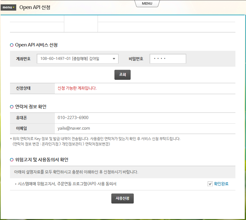API 신청/해지 탭을 선택 후, 이용약관에 동의후, [신청]을 누르면, 상태가 [등록]으로 표시된다.