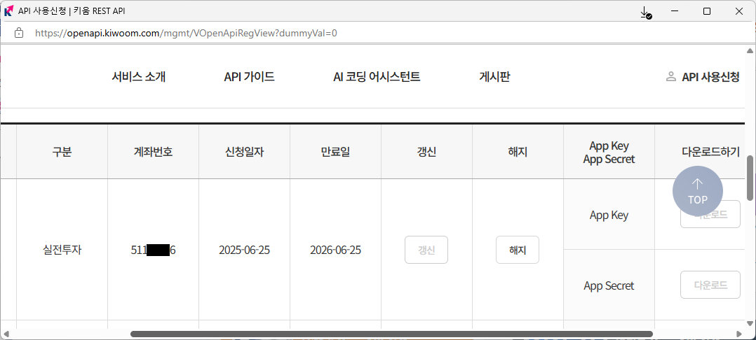 - IP 등록, 계좌 등록 및 APP KEY/SECRET KEY 다운로드¶