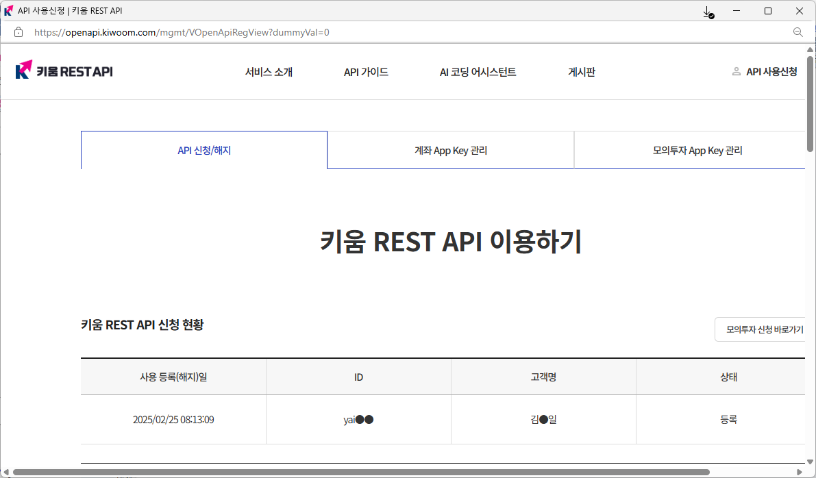API 신청/해지 탭을 선택 후, 이용약관에 동의후, [신청]을 누르면, 상태가 [등록]으로 표시된다.