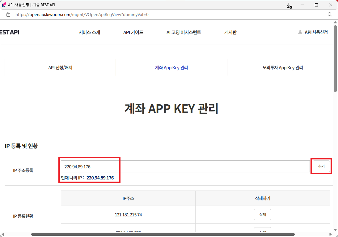 “현재 나의 IP :220.94.89.176” 처럼 정확한 IP를 표시하므로, 그 IP를 그대로 입력 후, [추가]를 눌러야 합니다.